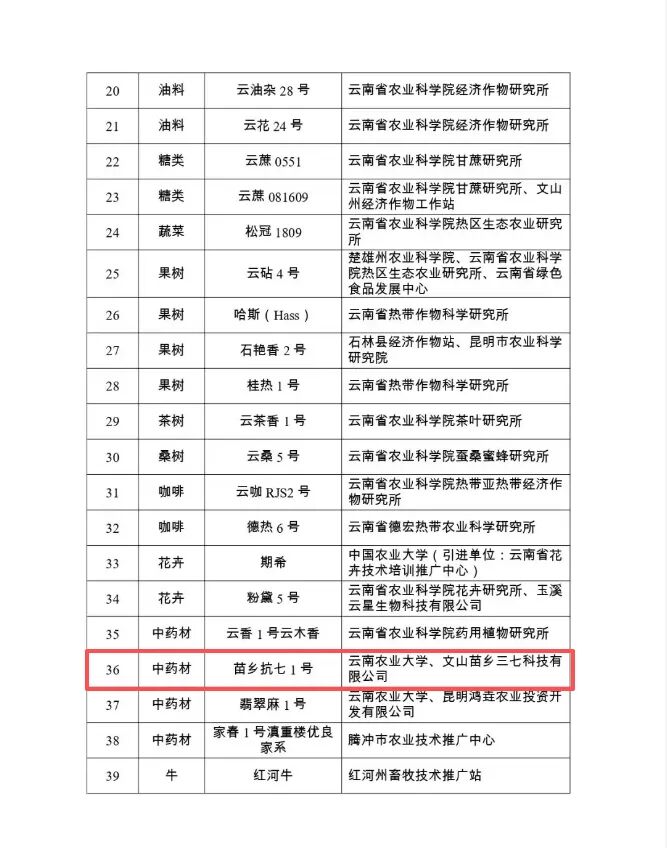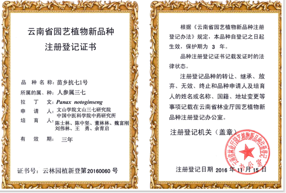近日,云南省农业农村厅正式发布2026年农业主导品种名单。由中国中医科学院中药研究所、云南农业大学、文山学院及苗乡三七联合选育的‘苗乡抗七1号’三七品种成功入选。这是‘苗乡抗七1号’继2023—2024连续两年入选云南省农业主导品种后第三次获此省级认可!堪称三七育种领域的璀璨明星!自1999年起,苗乡三七就联合文山学院、云南农业大学、中国中医科学院中药研究所等启动三七育种攻关,构建三七种质资源圃,共收集保育三七材料1.1万余份,建成我国最大的三七种质资源圃。在三七种植过程中,根腐病堪称“头号杀手”,它是药用植物生产中的一种毁灭性病害,发生后,容易传染、发病率高、防治困难,具有“植物癌症”之称。联合团队利用DNA标记辅助育种结合系统选育的方法,基于简化基因组测序技术检测出抗病群体的特异SNP位点,利用与三七抗根腐病相关的SNP位点筛选抗病群体进而辅助系统选育,该方法提高选育效率并缩短了选育周期。经过不懈努力,团队终于成功选育出首个三七抗病新品种——苗乡抗七1号(云林园植新登第20160060号)。这一品种的选育奠定了苗乡三七优质种源的坚实基础。